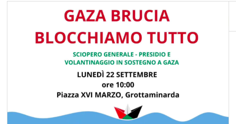 L’Arci Avellino ha annunciato per lunedì 22 settembre alle ore 10:00 una mobilitazione pubblica in Piazza XVI Marzo, con sciopero generale, presidio e volantinaggio a sostegno della popolazione di Gaza.
