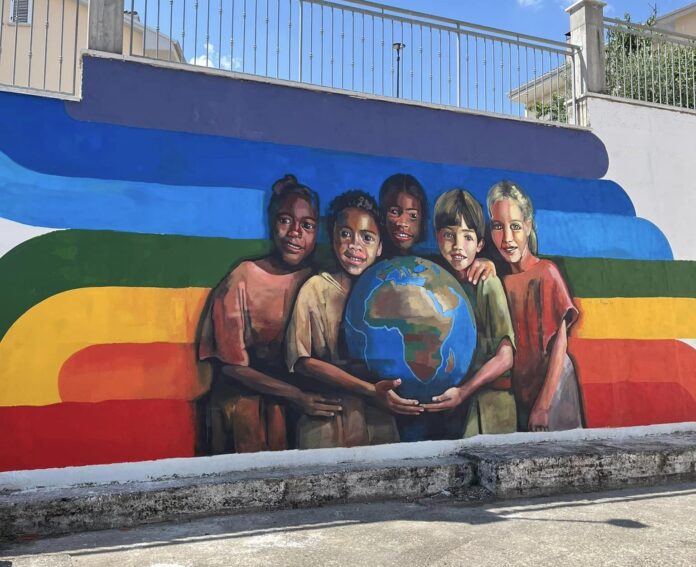 Il secondo murale è stato realizzato tra via Torquato Tasso e via Alessandro Manzoni su una palazzina privata ed è ben visibile già dall’uscita autostradale. Firmata ancora una volta da Sena raffigura una ragazza che fa il segno del cuore con le mani ed anche i suoi occhiali a specchio sono a forma di cuore a simboleggiare l’amore per la pace la cui scritta campeggia al di sotto. Infine il terzo murale dipinto da Marco Di Filippo su un muro del parcheggio nei pressi della Chiesa di San Michele Arcangelo raffigura un gruppo multietnico di bambini che abbraccia la Terra, dietro un arcobaleno di colori nel segno quindi della pace e della concordia tra i popoli per salvaguardare il pianeta. «Le tre opere di street art sono legate dallo stesso messaggio – ribadisce il Consigliere Antonio Vitale – quello di dare il buon esempio ai giovani nel segno del rispetto per il Pianeta, per il prossimo e quindi per la pace dei popoli. Ancora un ringraziamento alla ditta F.lli Grillo Noleggi per la disponibilità a titolo gratuito del cestello indispensabile per realizzare i murales di così grandi dimensioni ed un grazie alle famiglie che hanno accettato subito e di buon grado di far dipingere la facciata della propria abitazione».