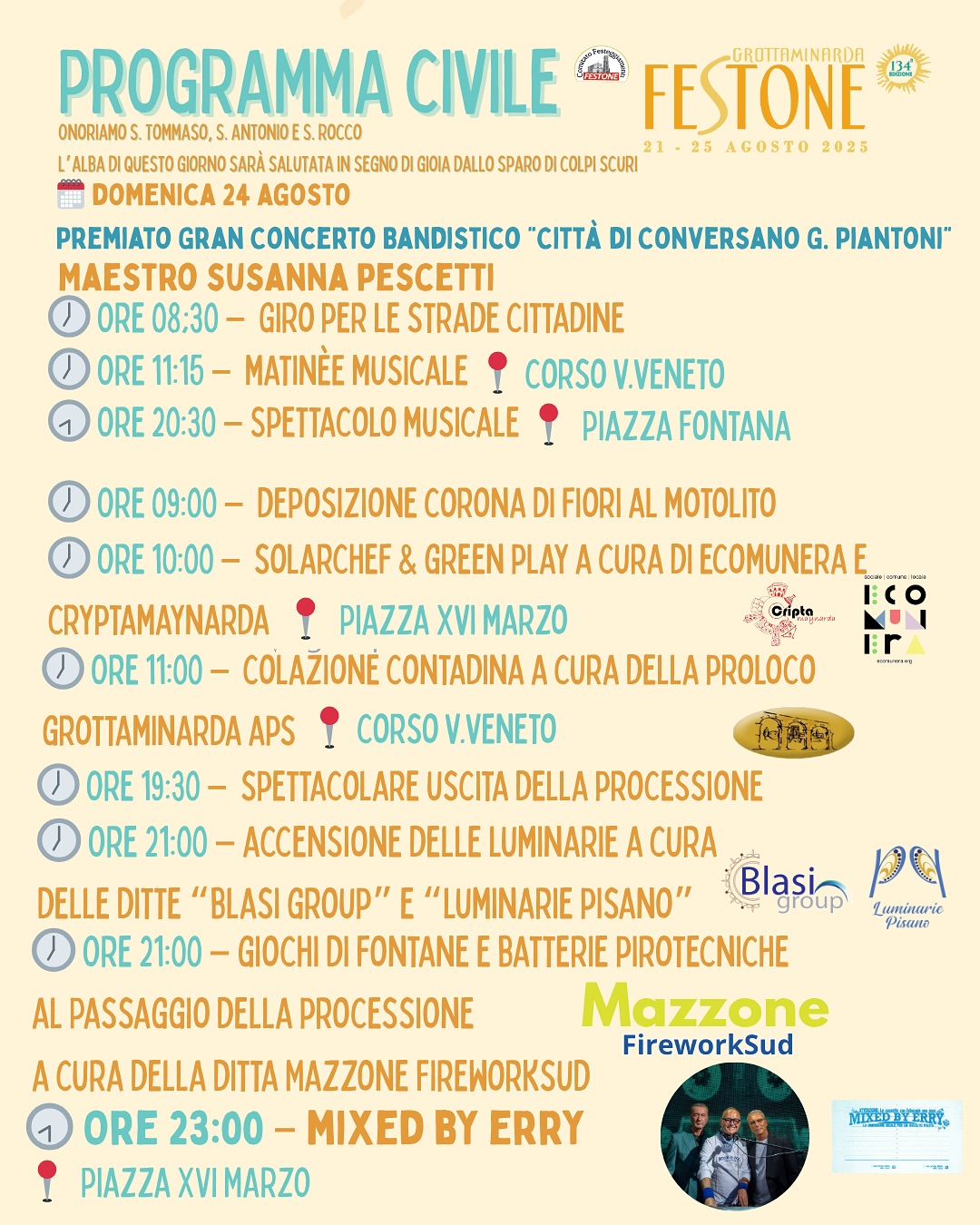 Le serate saranno un susseguirsi di emozioni: dai concerti sotto le stelle che incanteranno il pubblico, alle bande musicali che animeranno il corso, portando con sé il fascino delle tradizioni popolari e l’energia della festa di paese. Ogni evento in programma è molto più di un semplice appuntamento: è un invito a ritrovarsi.