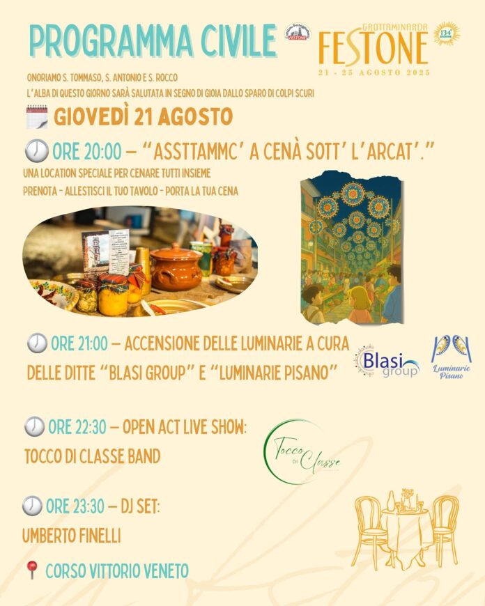 Ogni serata è pensata per lasciarci qualcosa dentro: un ricordo, un brivido, una risata. Il Festone è l’anima di Grotta. È il battito di una comunità che non smette mai di credere nella forza della propria identità – raccontano gli organizzatori”.