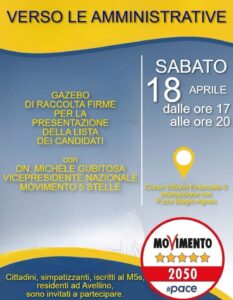 Il Movimento 5 Stelle informa la cittadinanza che domani, sabato 18 aprile, presso il gazebo allestito in occasione della raccolta firme per la presentazione delle liste in vista delle prossime elezioni amministrative di Avellino, sarà presente l’onorevole Michele Gubitosa, vicepresidente nazionale del Movimento 5 Stelle.