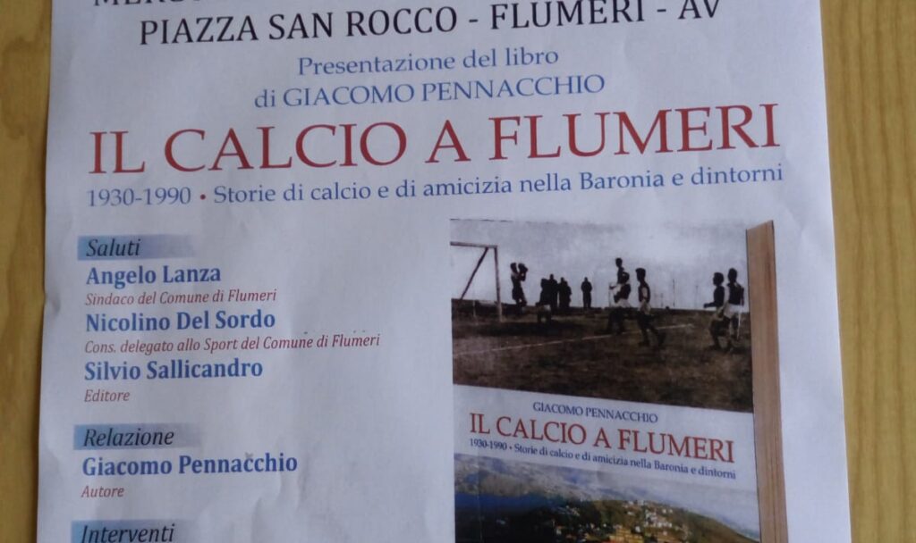 Sarà presentato mercoledì 19 agosto 2020, alle ore 19:30, in piazza San Rocco a Flumeri, in provincia di Avellino, il libro del professor Giacomo Pennacchio “Il calcio a Flumeri 1930-1990 storie di calcio e di amicizia nella Baronia e dintorni”.