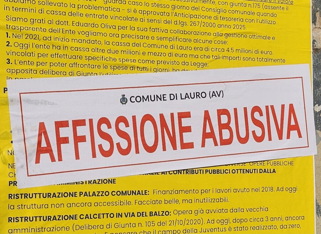 LAURO- “Manifesti abusivi o paura delle opinioni?”. Il giorno dopo l’ennesimo caso legato al manifesto di fine anno del gruppo di minoranza sullo stato dei conti del Comune di Lauro, ovvero la scritta “affissione abusiva” apposta dal personale dell’ente, in una nota lo stesso gruppo di minoranza lancia accuse all’amministrazione guidata da Rossano Sergio Boglione. “Il 2 novembre 2024 abbiamo presentato regolarmente una richiesta di affissione per i nostri manifesti, con l’intenzione di esporli il 4 novembre. Oggi, a mesi di distanza, quella richiesta è ancora inevasa” si legge nella nota. E poi continua : “All’inizio del 2025, decidendo di non fermarci davanti a questo silenzio e visto che altre richieste di diverso tipo non erano state accolte, abbiamo affisso ugualmente un nuovo manifesto. Risultato? Tutti i manifesti sono stati strappati, dai dipendenti dell’ACM, e chi si è occupato dell’affissione è stato perfino multato. Pensavamo fosse un caso isolato. Ma in occasione della festa patronale del 20 gennaio, abbiamo deciso di riprovarci, seguendo tutte le regole: richiesta scritta presentata, pagamento effettuato, versamento regolarmente registrato sul conto comunale. Eppure, anche questa volta, i manifesti sono stati coperti con fasce che dichiaravano “affissione abusiva.””. E la minoranza stigmatizza questo atteggiamento: “Abusiva?L’unica cosa che sembra davvero abusiva è il tentativo di distogliere l’attenzione da ciò che denunciamo. Opinioni diverse non sono mai “abusive.” Anzi, sono il cuore di una democrazia viva e partecipata.Il messaggio che vogliamo mandare ai cittadini è chiaro: le voci critiche, le opinioni diverse e le richieste di trasparenza non si possono cancellare con una fascia o una multa. Noi continueremo a parlare, a denunciare e a rappresentare il nostro paese, con o senza l’approvazione di chi vorrebbe farci tacere”.