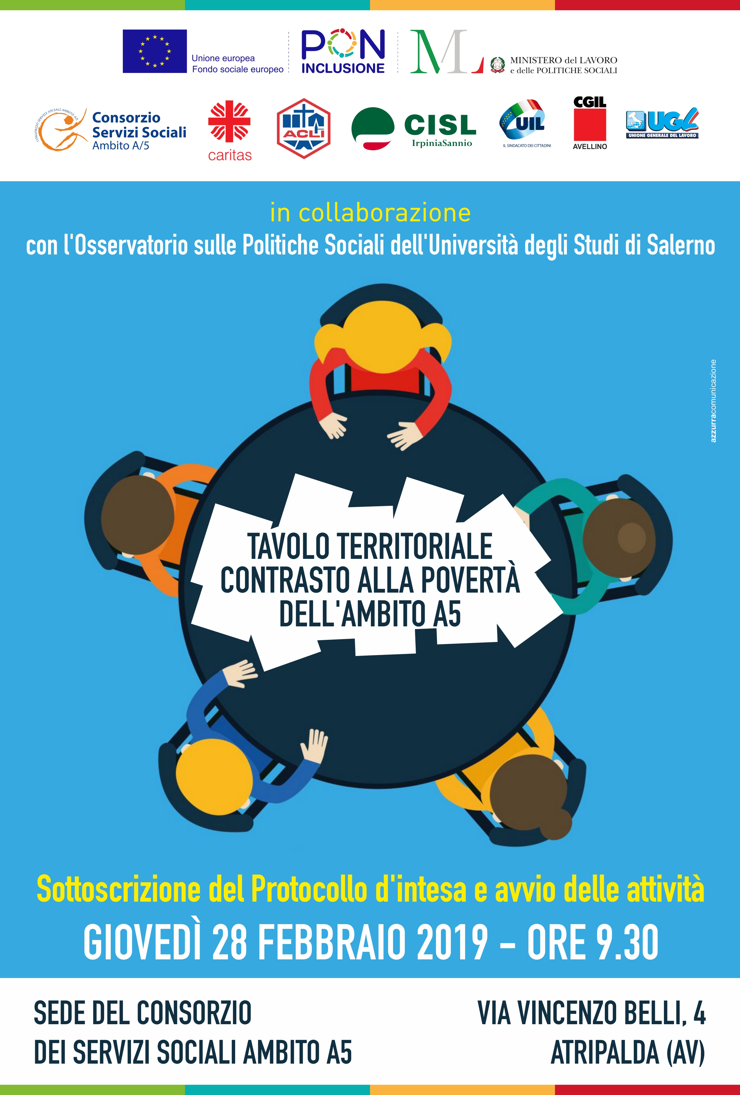 Si presenterà domani, 28 febbraio 2019, alle ore 9.30 presso la sede del Consorzio dei servizi sociali A5 in via Belli ad Atripalda il “Tavolo territoriale contro la Povertà” nell’ambito delle misure di contrasto alla povertà.