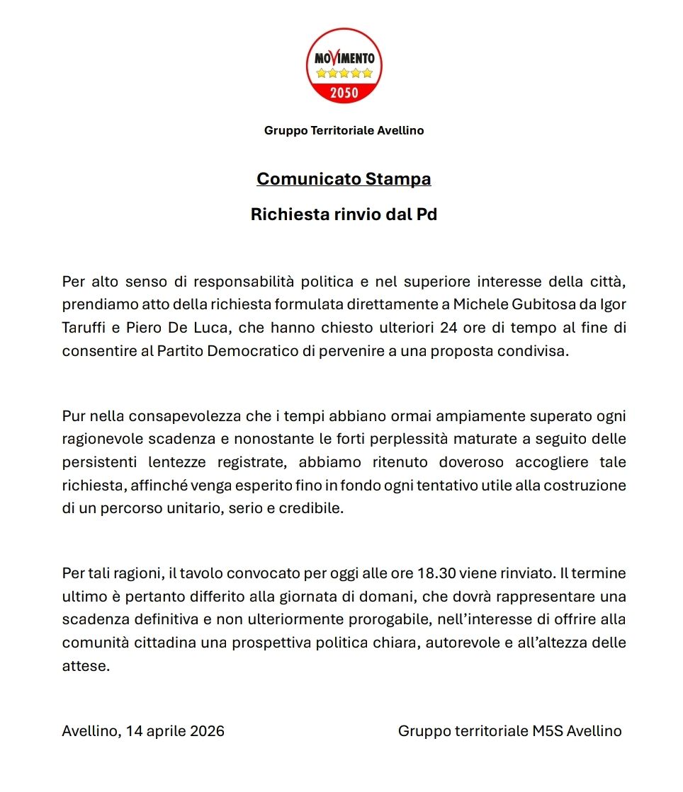 Il gruppo territoriale del Movimento 5 Stelle di Avellino ha deciso di concedere altre 24 ore al Partito Democratico, rinviando il tavolo politico inizialmente convocato per oggi alle 18.30. È quanto si legge in un comunicato diffuso dal M5S, che parla apertamente di una richiesta arrivata direttamente a Michele Gubitosa da parte di Igor Taruffi e Piero De Luca, finalizzata a consentire al Pd di arrivare a una proposta condivisa.