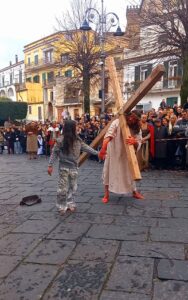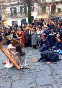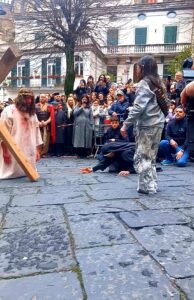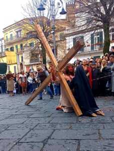 LAURO- Una bambina che getta via una cartucciera davanti a Gesù che arriva all’ultima stazione della Via Crucis. Una Passio Christi attualizzata e una forte testimonianza contro le ingiustizie e le guerre, quella che ha voluto testimoniare con la Passione di Gesù la Proloco di Taurano. Quest’anno e’ tornata una delle processioni della Passio più attese nel Venerdi’ Santo e nei riti della tradizione nel Vallo di Lauro. Ed e’ arrivata una forte testimonianza contro le odierne ingiustizie, dolori, le guerre in cui le vittime sono civili, e in particolari bambine e bambini. Una processione con 93 figuranti, quella organizzata dalla Pro Loco di Taurano. Ma non solo. Ad aprire il corteo ci sono quattro cavalli più una biga, ragazzi che conducono una portantina, mangiafuco, e giocolieri, serpenti e boa costrictor. Anche la scelta dei costumi è quella molto vicina agli originali. Prima della processione il canto dei “biancovestiti”, quelli di Taurano e di tutti i comuni del Vallo di Lauro nella Piazza principale di Lauro. Domenica sera l’appuntamento con la rappresentazione completa della Passio, alle 19:30 a Taurano. Si parte dall Ultima Cena ( nel piazzale antistante Convento San Giovanni del Palco) Orto degli ulivi; Sinedrio ( scuole ); Processo ( in Piazza ); Golgota ( Località Murilli).