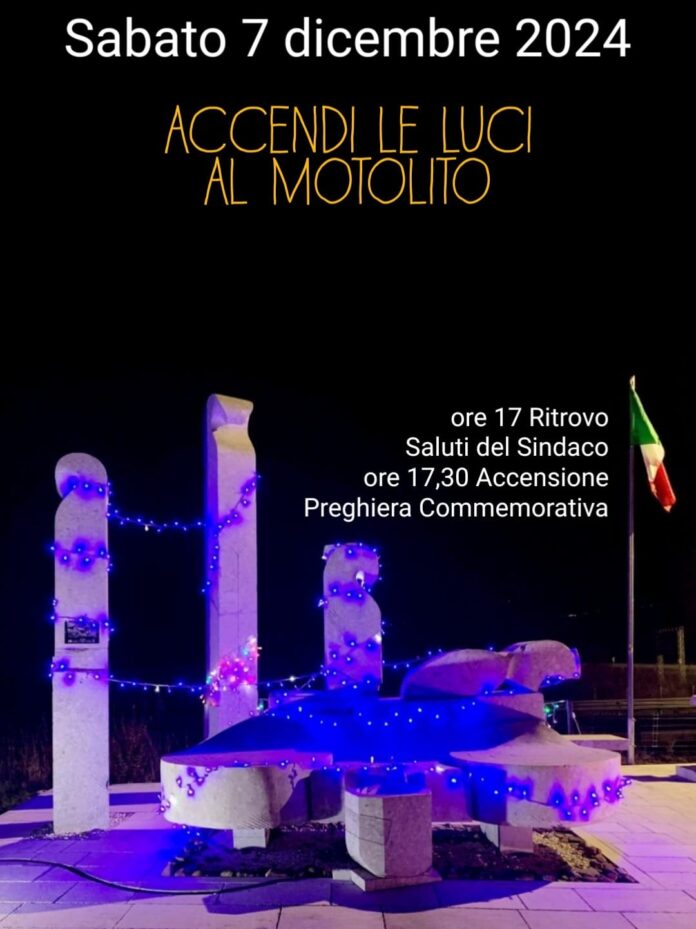 L’appuntamento con “Accendi le luci al Motolito” è alle ore 17:00 per il ritrovo ed il saluto del Sindaco, poi alle ore 17:30 l’accensione e la preghiera commemorativa. Verrà esposto anche un cartello quale invito alla prudenza.