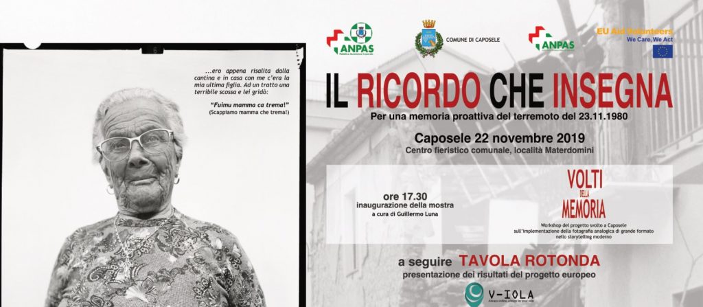 Il progetto V-IOLA (Volunteer-Based International On Line Asset), è stato un progetto che ha avuto come obiettivo generale quello di sviluppare materiali utili per concretizzare un servizio europeo online per il volontariato, per supportare la protezione civile dei paesi coinvolti dal progetto nelle attività di riduzione dei rischi, prevenzione e preparazione agli interventi e in quest’ottica, ha deciso di svolgere alcune di queste attività nel territorio del sisma del 1980, l’Irpinia e a Caposele nello specifico, dove si sono realizzate interviste a diversi soggetti sul tema del post terremoto del 1980: Il sindaco in carica il giorno del terremoto, il sindaco che fu eletto negli anni immediatamente successivi, un’insegnante dell’Istituto Comprensivo locale, alcune testimonianze (anziani del centro autogestito e supportato dalla PA, volontari) recuperate presso l’associazione di volontariato (la Pubblica Assistenza, in questo caso, che nacque e si è radicata a seguito di quell’esperienza). Sono inoltre state fatte una serie di riprese ai luoghi e al territorio circostante e una serie di fotografie con tecnica analogica ad alcuni cittadini a cui si era chiesto di raccontare quale fosse il loro primo ricordo di quella sera. Dal materiale raccolto è stata realizzata una mostra (volti della Memoria) che sarà inaugurata in apertura della manifestazione.