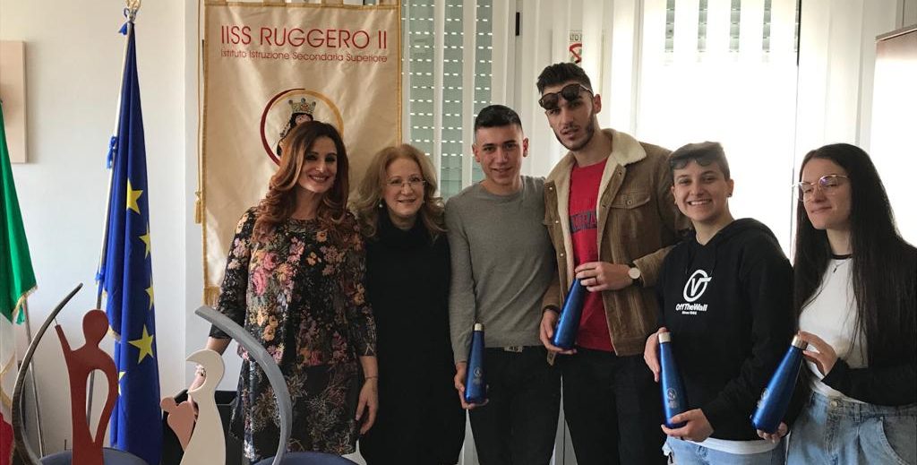 Il Ruggero II si conferma “plastic free”. Ieri mattina c’è stata la consegna ufficiale delle borracce personalizzate a tutti gli studenti dell’Istituto. Presenti all’iniziativa la dirigente scolastica prof.ssa Teresa De Vito, unitamente al suo vice prof. Domenico Ciccarelli, l’ex presidente del Consiglio d’Istituto, la dott.ssa Monica De Benedetto, la neo presidente del Consiglio d’Istituto, prof.ssa Paola Napoli, il responsabile del progetto prof. Giuseppe Caggiano e i rappresentanti degli studenti del Ruggero II.