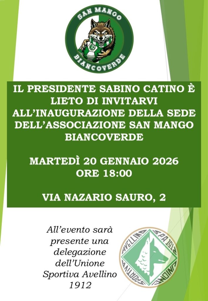 Il presidente Sabino Catino è lieto di invitare la cittadinanza all’inaugurazione della sede dell’Associazione San Mango Biancoverde, in programma martedì 20 gennaio 2026 alle ore 18:00, in via Nazario Sauro, 2.
