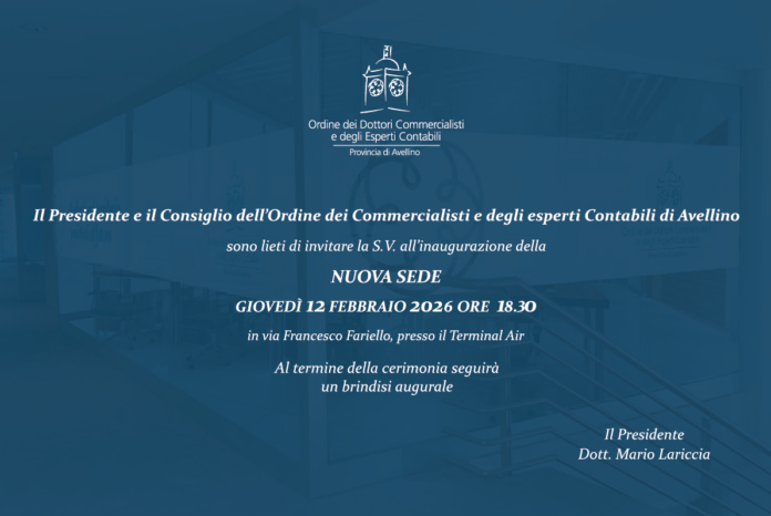 Un nuovo spazio dedicato alla professione, al dialogo con le Istituzioni e al servizio del territorio: l’Ordine dei Dottori Commercialisti e degli Esperti Contabili di Avellino inaugura la nuova sede giovedì 12 febbraio alle ore 18.30, in via Francesco Fariello (presso il Terminal Air). La cerimonia di inaugurazione rappresenta un momento di particolare rilevanza per la vita dell’Ordine e per l’intera comunità professionale del territorio. All’evento prenderanno parte il presidente Dottor Mario Lariccia con i componenti del Consiglio dell’Ordine e le massime autorità cittadine. L’inaugurazione sarà anche l’occasione per i saluti da parte del presidente Mario Lariccia, che si appresta a concludere il proprio mandato alla guida dell’Ordine.