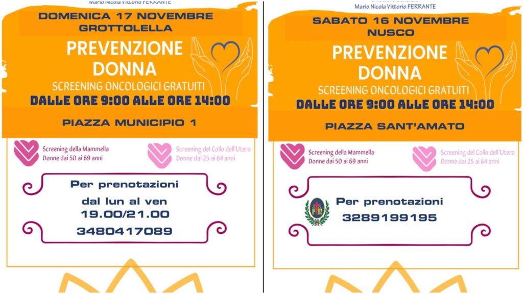 screening della mammella, con l’esecuzione gratuita della mammografia, e per le donne dai 25 ai 64 anni, residenti in provincia di Avellino, sarà possibile aderire allo screening del collo dell’utero con l’esecuzione del Pap test.