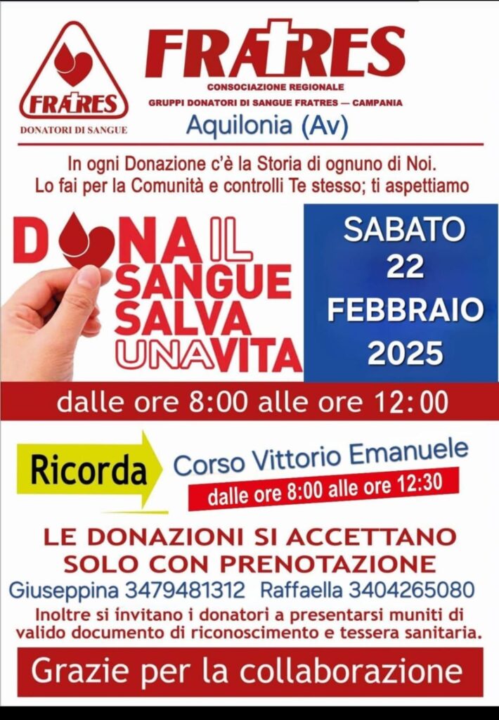 Sabato 22 febbraio 2025, la comunità di Aquilonia avrà l’opportunità di partecipare a una grande iniziativa di solidarietà a cura di Fratres Donatori di Sangue Campania. L’evento, intitolato “Dona il Sangue, Salva una Vita”, si terrà presso Corso Vittorio Emanuele, dalle ore 8:00 alle ore 12:00.