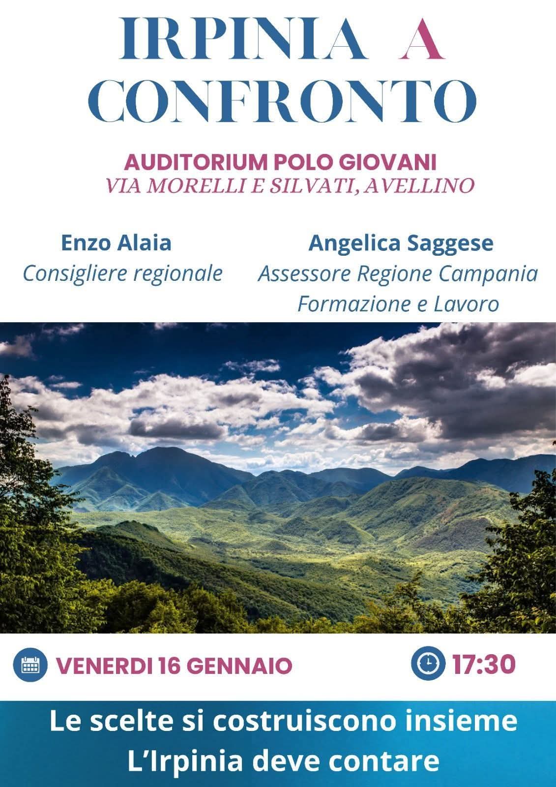 Si terrà venerdì 16 gennaio alle ore 17.30, presso l’Auditorium Polo Giovani di via Morelli e Silvati ad Avellino, l’incontro pubblico dal titolo “Irpinia a confronto”, un momento di dialogo dedicato alle prospettive di crescita del territorio.