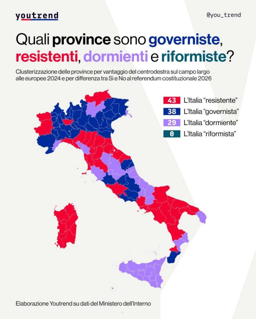 A pochi giorni dalla vittoria del No al Referendum sulla separazione delle carriere, l’Irpinia si conferma parte di quell’Italia “resistente” alla riforma costituzionale della giustizia. È quanto emerge dall’ultima analisi di YouTrend che, sulla base dei dati ufficiali diffusi dal Ministero dell’Interno, ha classificato le province italiane sulla base di due indicatori: il vantaggio tra gli schieramenti alle Europee 2024 e la differenza tra i voti Sì e No al referendum costituzionale del 2026.