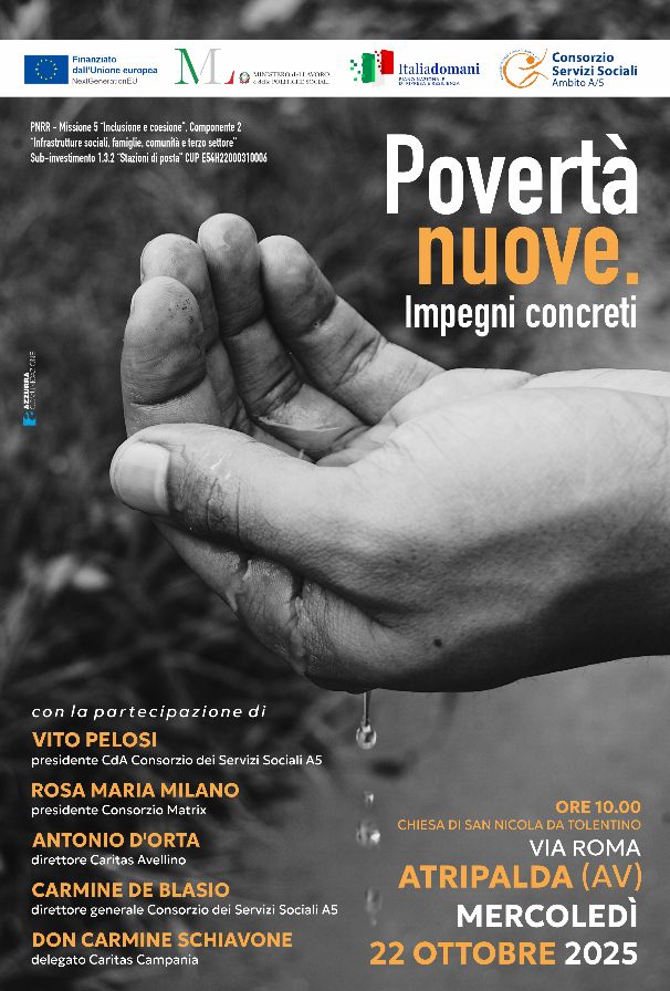 Le nuove povertà sono il filo rosso del confronto, promosso dal Consorzio dei Servizi Sociali Ambito A5, in programma Mercoledì 22 Ottobre alle 10 ad Atripalda, nella Chiesa di San Nicola da Tolentino in via Roma. L’iniziativa si collega alla misura di contrasto alla povertà finanziata dal PNRR, che prevede diverse iniziative e interventi, in molti casi già in corso nei comuni dell’Ambito A5.