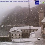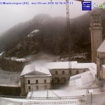Vista dall’osservatorio meteorologico, la telecamera inquadra il campanile del Santuario a circa 1250 metri di quota. L’inquadratura mostra i tetti del complesso e parte della adiacente montagna.