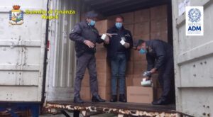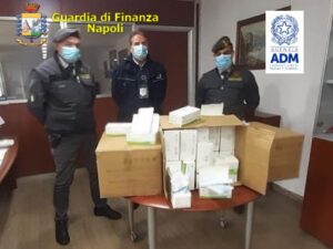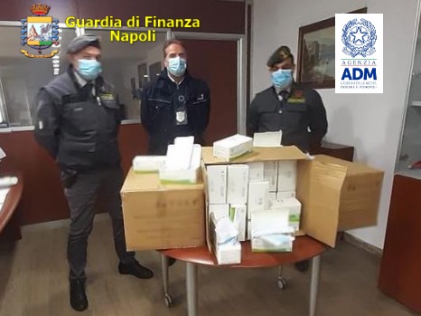 Il comando provinciale della Guardia di Finanza e ufficiali di PT e PG dell’ADM di Napoli hanno intercettato, all’interno del porto, nel contesto delle attività congiunte di analisi di rischio in ambito doganale, un container con 812.000 mascherine di provenienza cinese prive delle certificazioni attestanti la conformità.