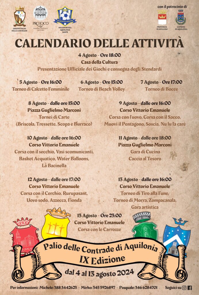 Durante i dieci giorni dell’evento, che si aprirà Domenica 4 agosto, con la presentazione ufficiale dei giochi e la consegna degli stendardi, i cittadini e i visitatori avranno la possibilità di godere di un’esperienza unica, immergendosi nel cuore della cultura autentica di Aquilonia: sostenendo i colori e i simboli delle quattro contrade, sarà possibile riscoprire le antiche tradizioni e i costumi, che ancora oggi sono custoditi e tramandati con orgoglio.