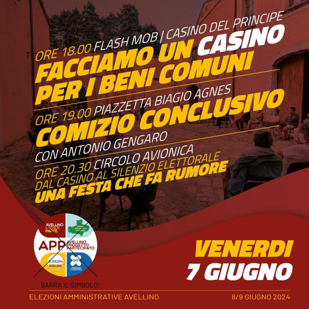 La lista APP Avellino Progetto Partecipato annuncia la chiusura della sua campagna elettorale che si terrà il 7 giugno 2024. L’evento avrà luogo nello spiazzale antistante al Casino del Principe alle ore 18:00. A seguire, alle ore 19:00, i membri e i sostenitori di APP si sposteranno per partecipare alla chiusura della campagna elettorale di coalizione, concludendo la serata al circolo Arci Avionica fino all’inizio del silenzio elettorale.