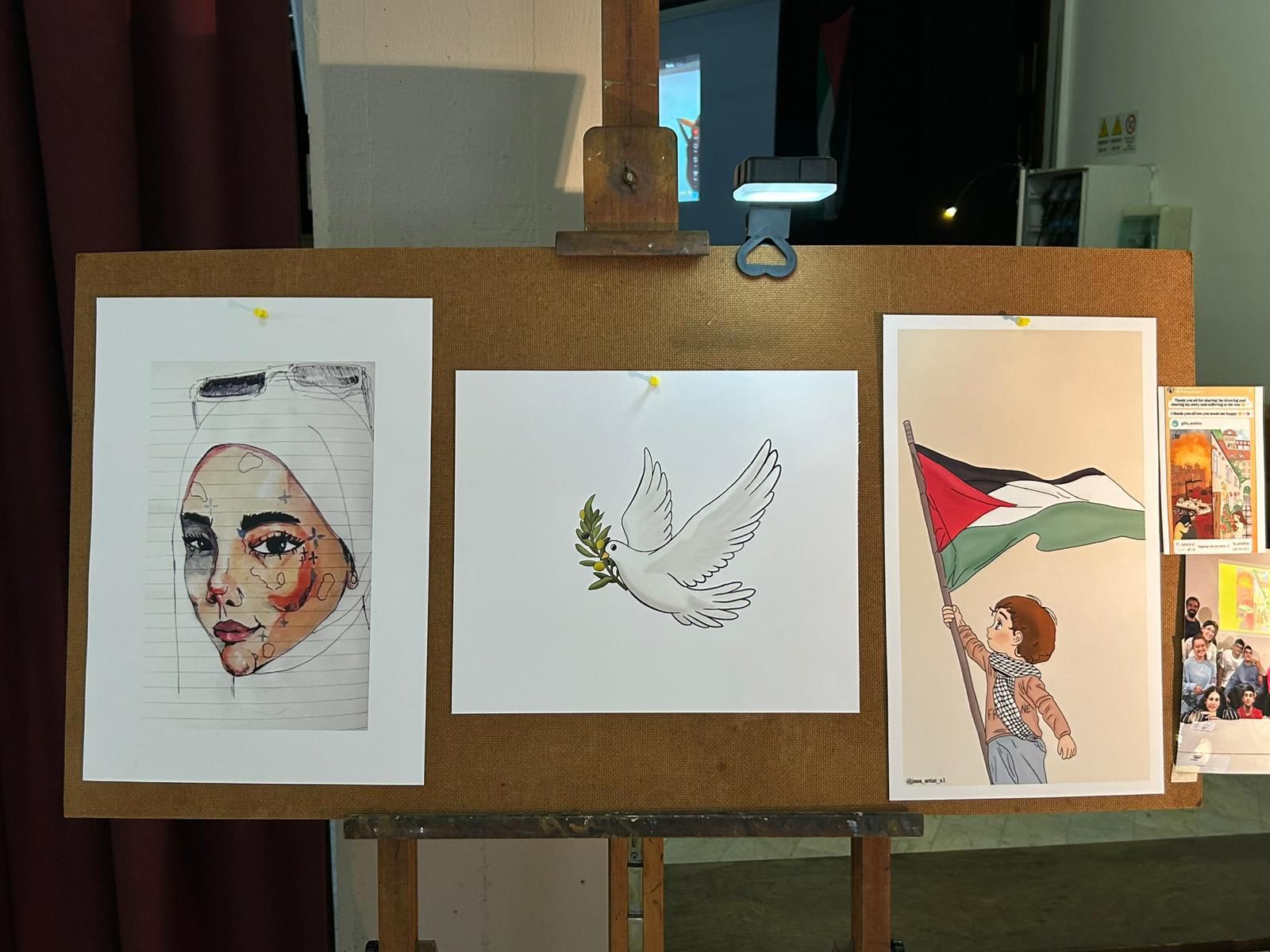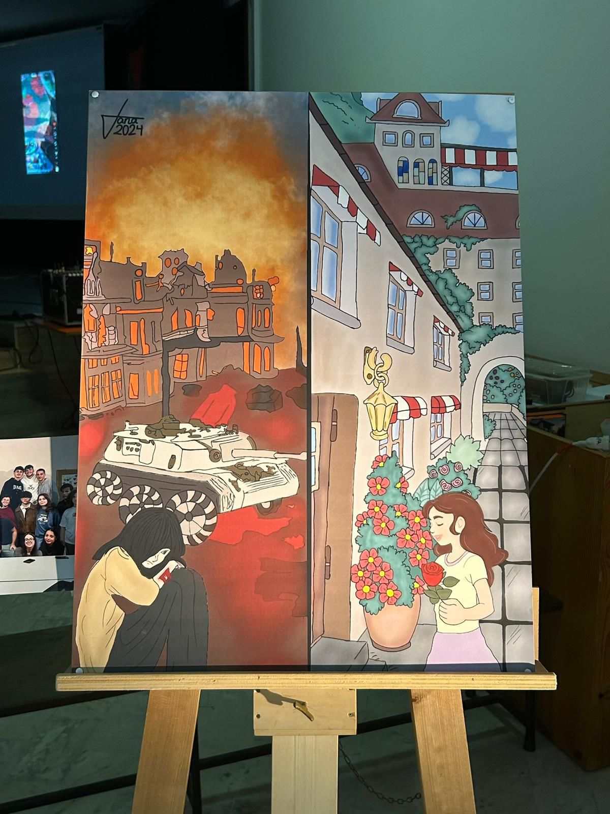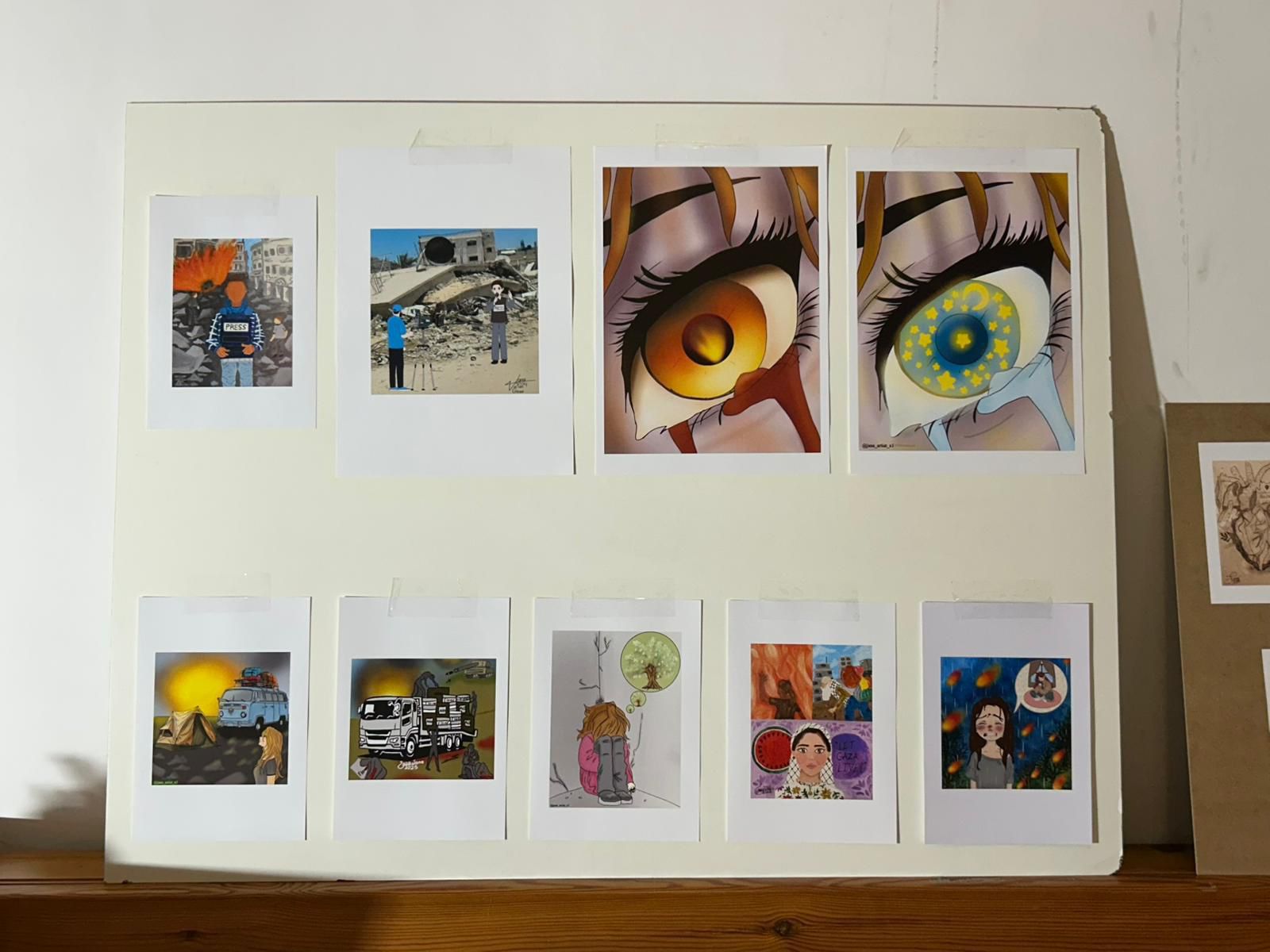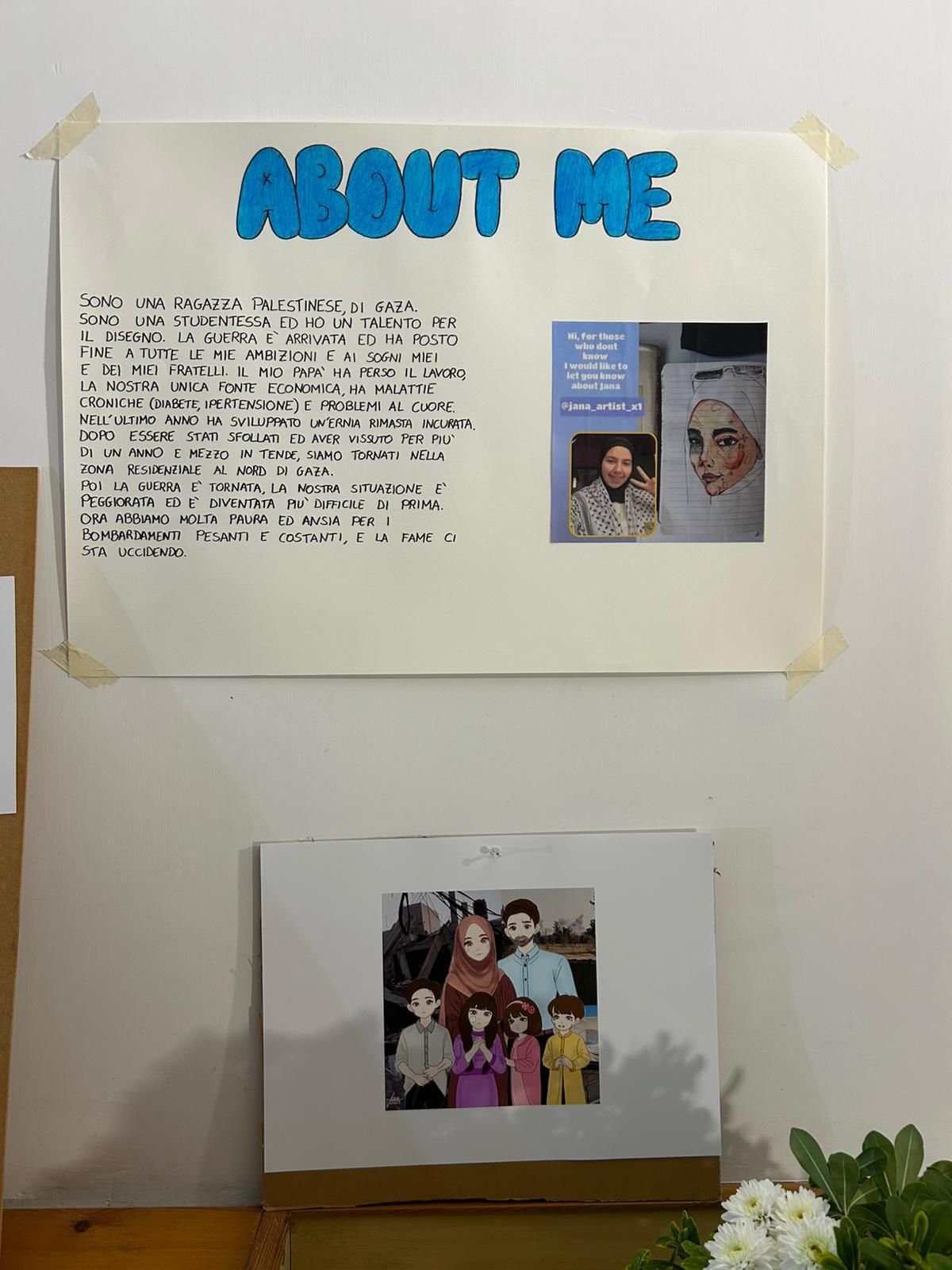 A dimostrazione di ciò, la mostra organizzata ha come protagonisti i dipinti (riproduzioni) della quindicenne Jana, adolescente di Gaza che ha saputo convogliare il dolore in arte. Le riproduzioni delle sue opere, esposte in mostra, parlano di sogni infranti, di ombre e di speranza: una “stanzetta” perduta che diventa tela per raccontare l’adolescenza negata e la resistenza quotidiana. La Gi.Fra. è in contatto con l’artista quindicenne dall’Ottobre del 2024: infatti, nel corso dell’evento, è stato trasmesso un videomessaggio da lei dedicato ai presenti, attraverso cui ha evidenziato nuovamente le difficoltà della sua famiglia che – al pari di innumerevoli altre – sta lottando ad un genocidio, a difesa della propria legittima sopravvivenza.