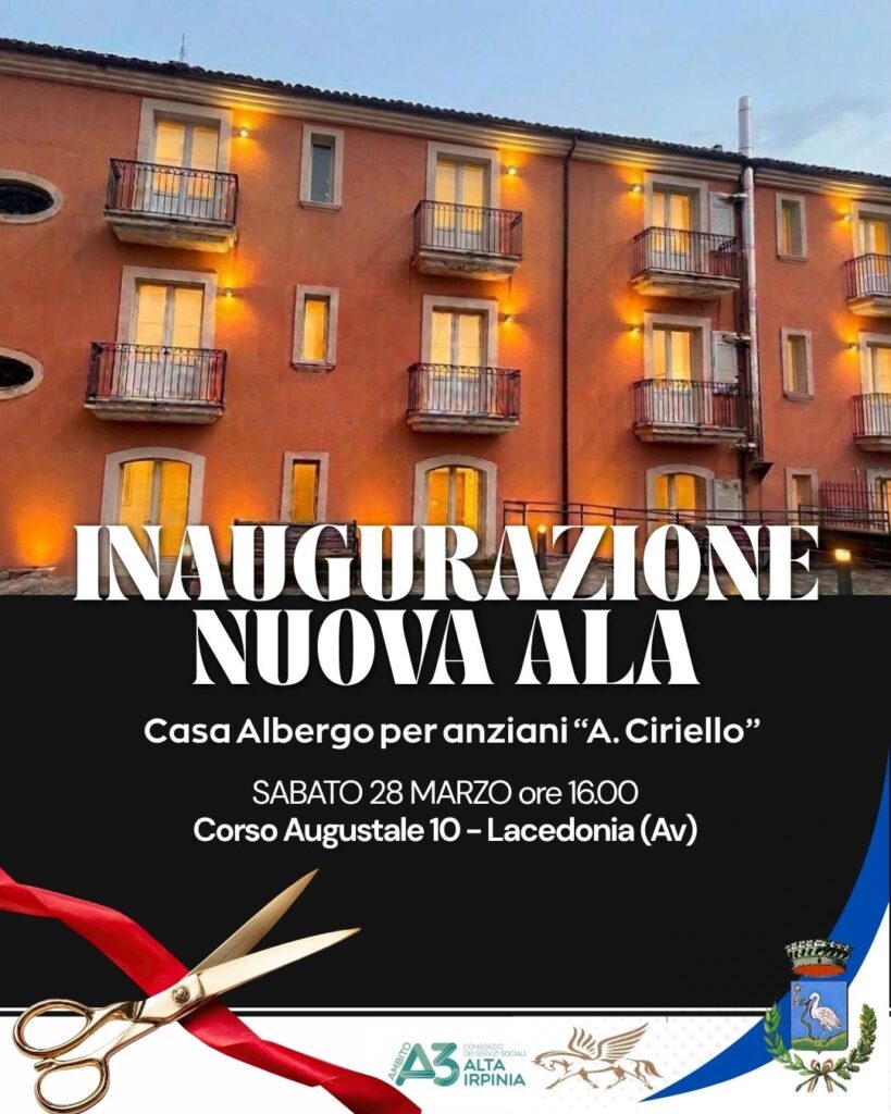 Sabato 28 marzo, alle ore 16:00, si terrà nel Comune di Lacedonia (AV) l’inaugurazione ufficiale della nuova ala della Casa Albergo per anziani “A. Ciriello”, sita in Corso Augustale 10.