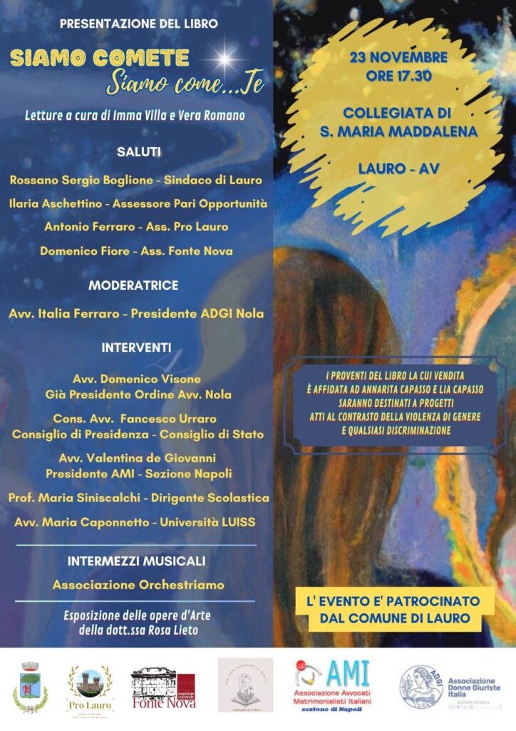 Tra i relatori il Senatore Francesco Urraro, gli avvocati Domenico Visone, Maria Caponnetto, Valentina De Giovanni, (tra le scrittrici del libro), Maria Siniscalchi dirigente scolastica dellโ IC โB. Croceโ di Lauro. Interverranno anche il Sindaco di Lauro Rossano Sergio Boglione, lโAssessore alle Pari Opportunitร del Comune di Lauro Ilaria Aschettino, Domenico Fiore e Antonio Ferraro presidenti delle Associazioni Fonte Novaย e Pro Lauro che hanno organizzato e promosso lโevento in collaborazione col Sodalizio Culturale Per non fermare la mente