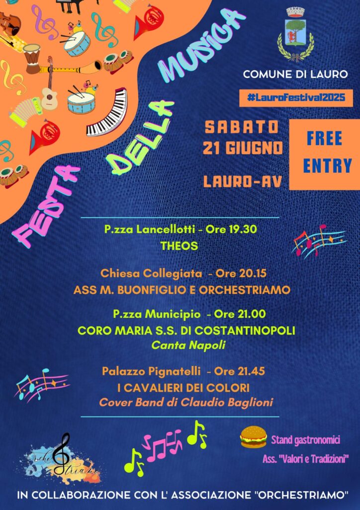 Sabato 21 giugno, in occasione della Giornata Europea della Musica, il Comune di Lauro presenta la Festa della Musica promossa dall’Assessorato alle Associazioni in collaborazione con l’Associazione “Orchestriamo”. Un evento diffuso che coinvolgerà il centro del paese a partire dalle ore 19.30.