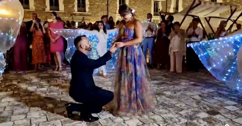La proposta di matrimonio deve essere unica e nello stesso tempo celebrata in maniera speciale. Infatti, Boris, nel giorno del Sì del fratello della sua amata, ha deciso di stupirla e ci è riuscito. In ginocchio, dinanzi ai suoi piedi, con l’anello in mano le ha chiesto di vivere tutta la vita insieme a lui: “Mi vuoi sposare?”,  Lucia, emozionatissima non ha esitato a dire di Sì al suo Boris.