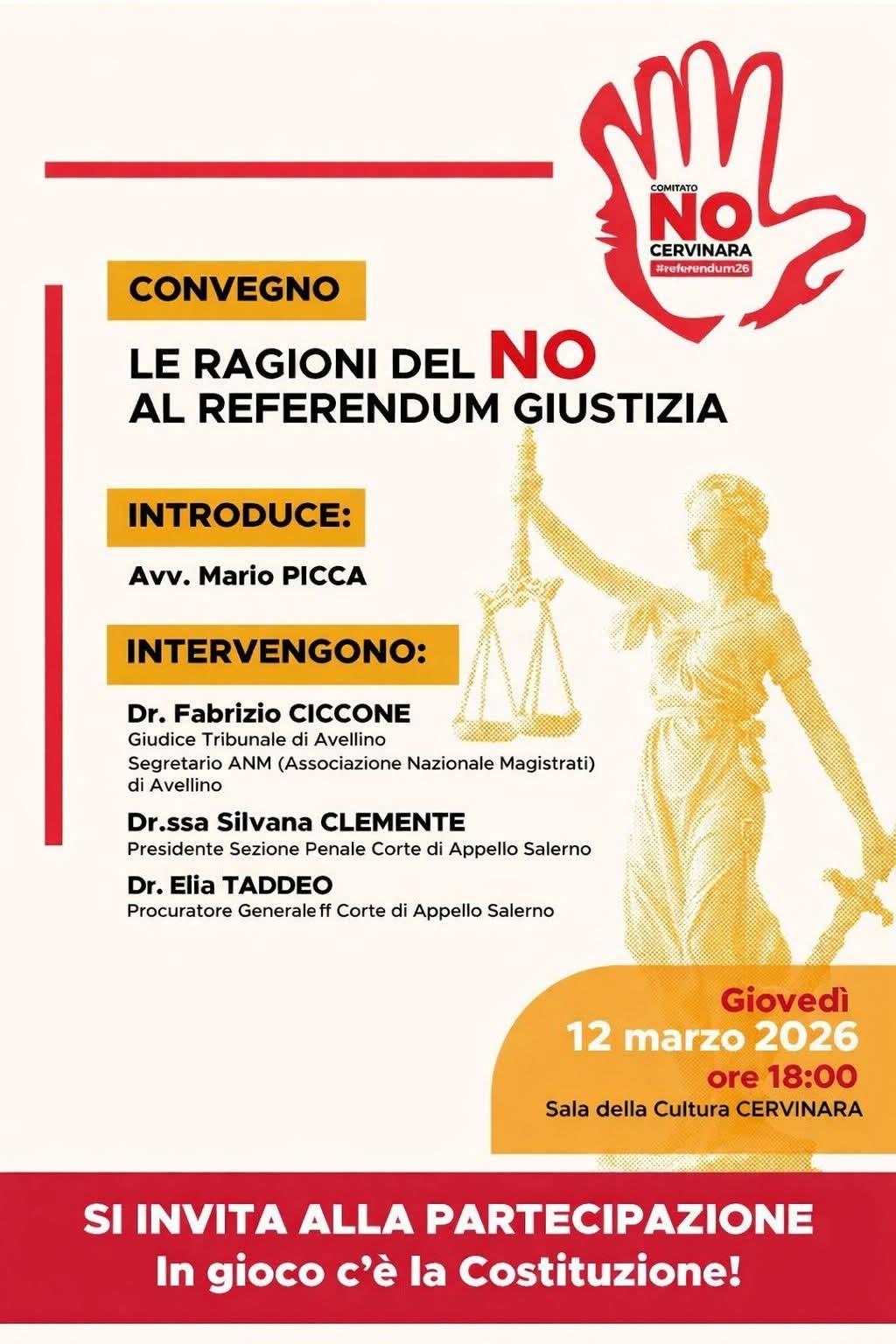 Giovedì 12 marzo alle 18 nella Sala della Cultura di Cervinara, il “Comitato per il No” nato nel comune della Valle Caudina organizza un dibattito sulle “Ragioni del No” al quale parteciperanno l’avvocato Mario Picca per i saluti, il giudice Fabrizio Ciccone, segretario della Sottosezione dell’Anm di Avellino, il giudice Silvana Clemente, presidente della Sezione Penale della Corte di Appello di Salerno. Le conclusioni saranno affidate dal Procuratore Generale ff di Salerno Elia Taddeo.