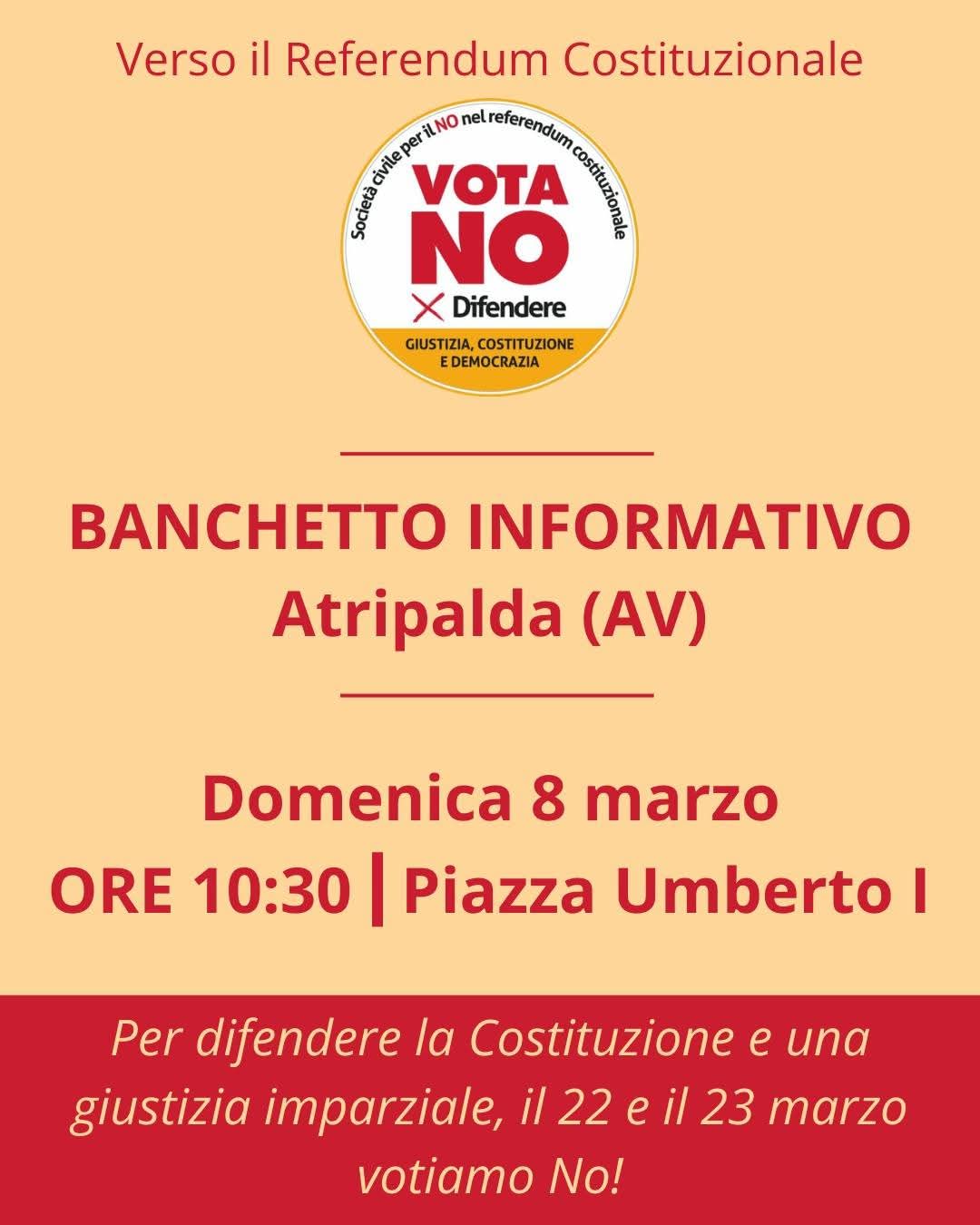 Il comitato Irpino della società civile per il No al referendum costituzionale organizza a partire dalle ore 10:30 un banchetto informativo in Piazza Umberto I ad Atripalda.