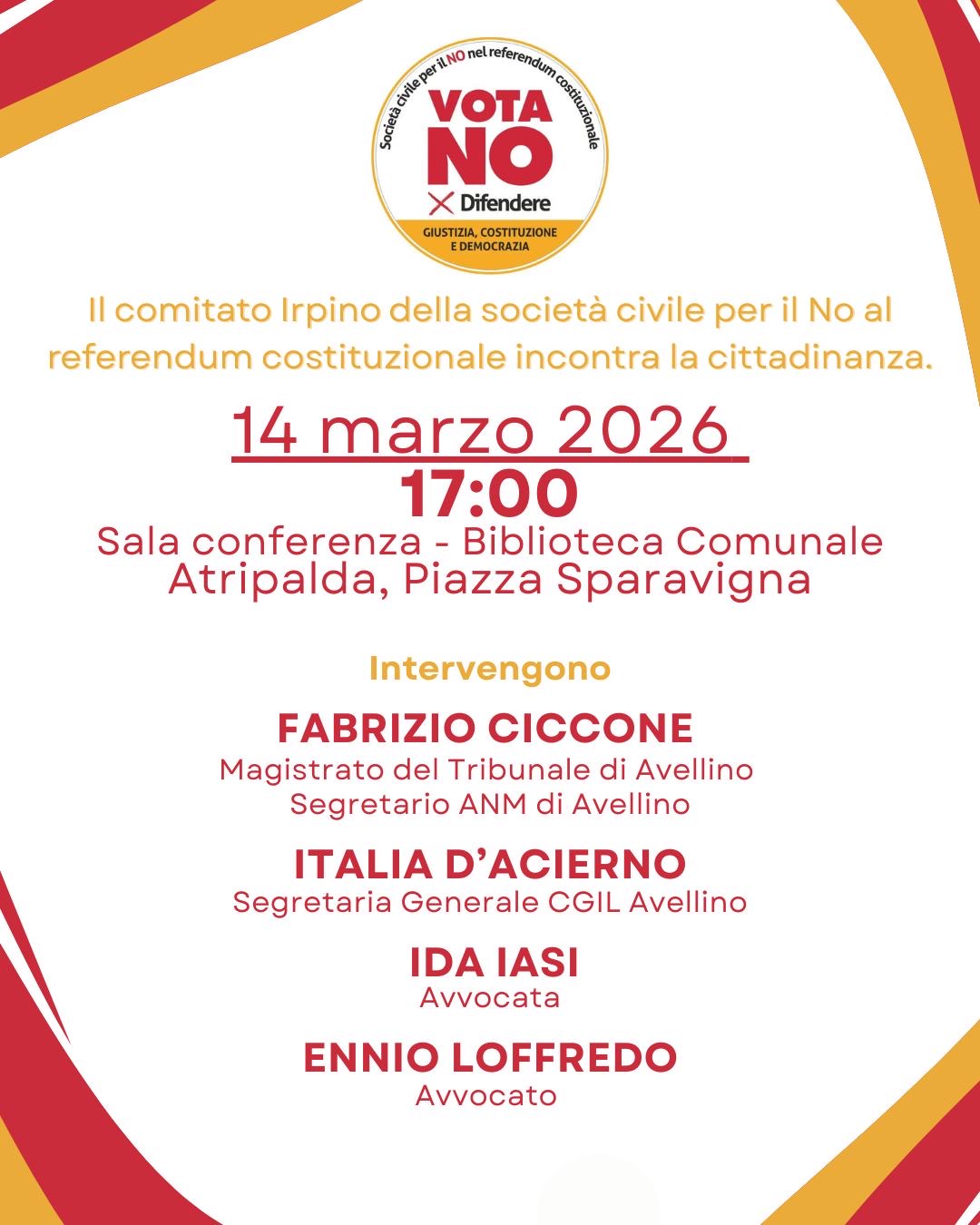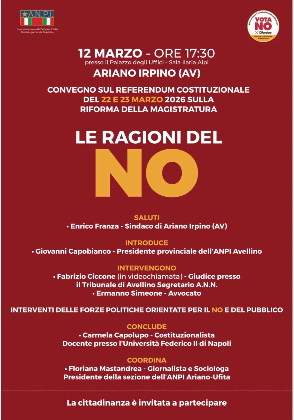 Anche nella citta’ del Tricolle ci sara’ un iniziativa organizzata da Anpi e Comitato per il No. Quella organizzata il 12 marzo alle 17:30 nella Sala Ilaria Alpi del Palazzo degli Uffici della Citta’ del Tricolle. Ci saranno i saluti di Enrico Franza – Sindaco di Ariano Irpino, l’introduzione di Giovanni Capobianco – Presidente provinciale dell’ANPI Avellino. Gli interventi di Fabrizio Ciccone (in videochiamata) – Giudice presso il Tribunale di Avellino Segretario A.N.M di Avellino, Ermanno Simeone – Avvocato. Le conclusioni affidate a Carmela Capolupo – Costituzionalista