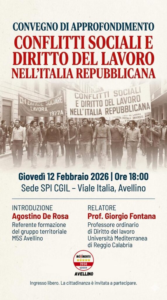 Il Gruppo territoriale di Avellino del Movimento 5 Stelle ha organizzato un incontro pubblico sul tema “Conflitti sociali e diritto del lavoro nell’Italia repubblicana”, che avrà luogo il 12 febbraio 2026 alle ore 18:00, ad Avellino, presso la sede dello SPI CGIL in Viale Italia 40.