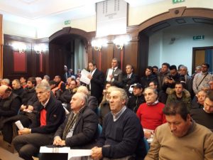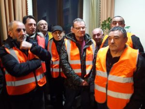 Tra gli interventi, anche il presidente di Confindustria Avellino, Giuseppe Bruno, chiede un piano di ripresa dei lavori e dichiara: “Siamo preoccupati per le difficoltà delle imprese, i sub-appaltatori in particolare. Confindustria svolge come sempre un ruolo di servizio per le imprese e il territorio. Questa è un’opera necessaria“. In sala Giovanni Grasso, anche Salvatore Castellano (della Castellano Costruzione Spa) e i suoi operai (in foto)”trentacinque persone a casa dal 31 dicembre” dice l’imprenditore.