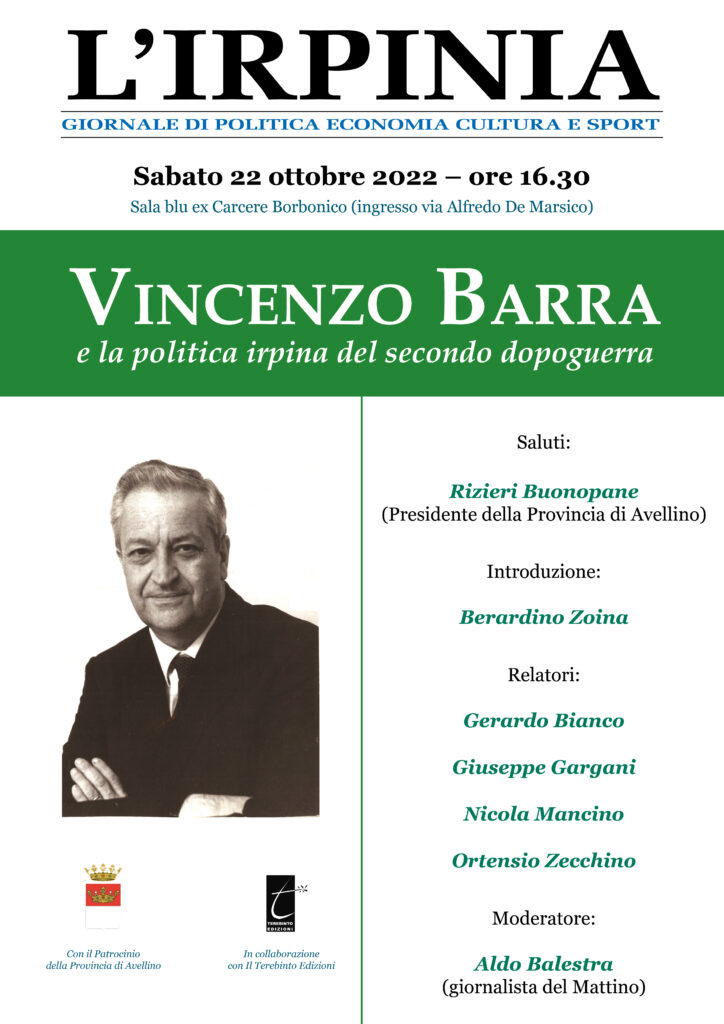 Nella ricorrenza del trentennale della scomparsa di Vincenzo Barra (Avellino, 23 ottobre 1915 – 17 gennaio 1992) – uno dei fondatori insieme con Fiorentino Sullo della Democrazia Cristiana in Irpinia, presidente della Provincia dal 5 luglio 1952 al 6 agosto 1961, presidente dell’ospedale civile di Avellino nel 1962-64, vice presidente nel 1966-71 dell’Ente per l’irrigazione e lo sviluppo fondiario di Puglia, Basilicata e Campania, senatore della Repubblica (1970-76) – il giornale “L’Irpinia” ha organizzato un convegno, con il patrocinio della Provincia di Avellino ed in collaborazione con il Terebinto Edizioni, sul tema “Vincenzo Barra e la politica irpina del secondo dopoguerra”.