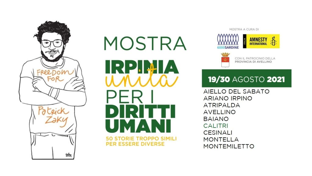 Anche Calitri aderisce al progetto L’Irpinia unita per i diritti umani – 50 storie troppo simili per essere diverse. Diventano 9, quindi, i comuni della provincia di Avellino che ospiteranno dal 19 al 30 agosto la mostra promossa da Amnesty International e 6000 Sardine e inaugurata lo scorso giugno a Bologna in occasione del trentesimo compleanno di Patrick Zaki. Cinquanta pannelli, esposti in modalità diffusa in suggestive location, disegnati da Gianluca Costantini e recanti i volti e le storie di 50 prigionieri di coscienza detenuti 19 differenti paesi.