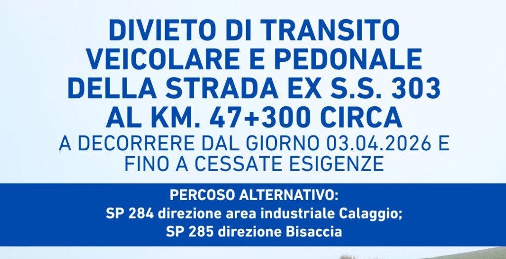 Nuove criticità alla viabilità a causa dell’emergenza maltempo. Il Comune di Lacedonia ha comunicato la chiusura al transito veicolare e pedonale della Ex S.S. 303, in direzione Bisaccia e viceversa, all’altezza del km 47+300. Il provvedimento è scattato da oggi, 3 aprile 2026, e resterà in vigore fino a quando non saranno ripristinate le necessarie condizioni di sicurezza. Per gli spostamenti, l’amministrazione comunale invita gli automobilisti a utilizzare i percorsi alternativi predisposti, con deviazione sulla SP 284, in zona area industriale Calaggio, oppure sulla SP 285 in direzione Bisaccia.