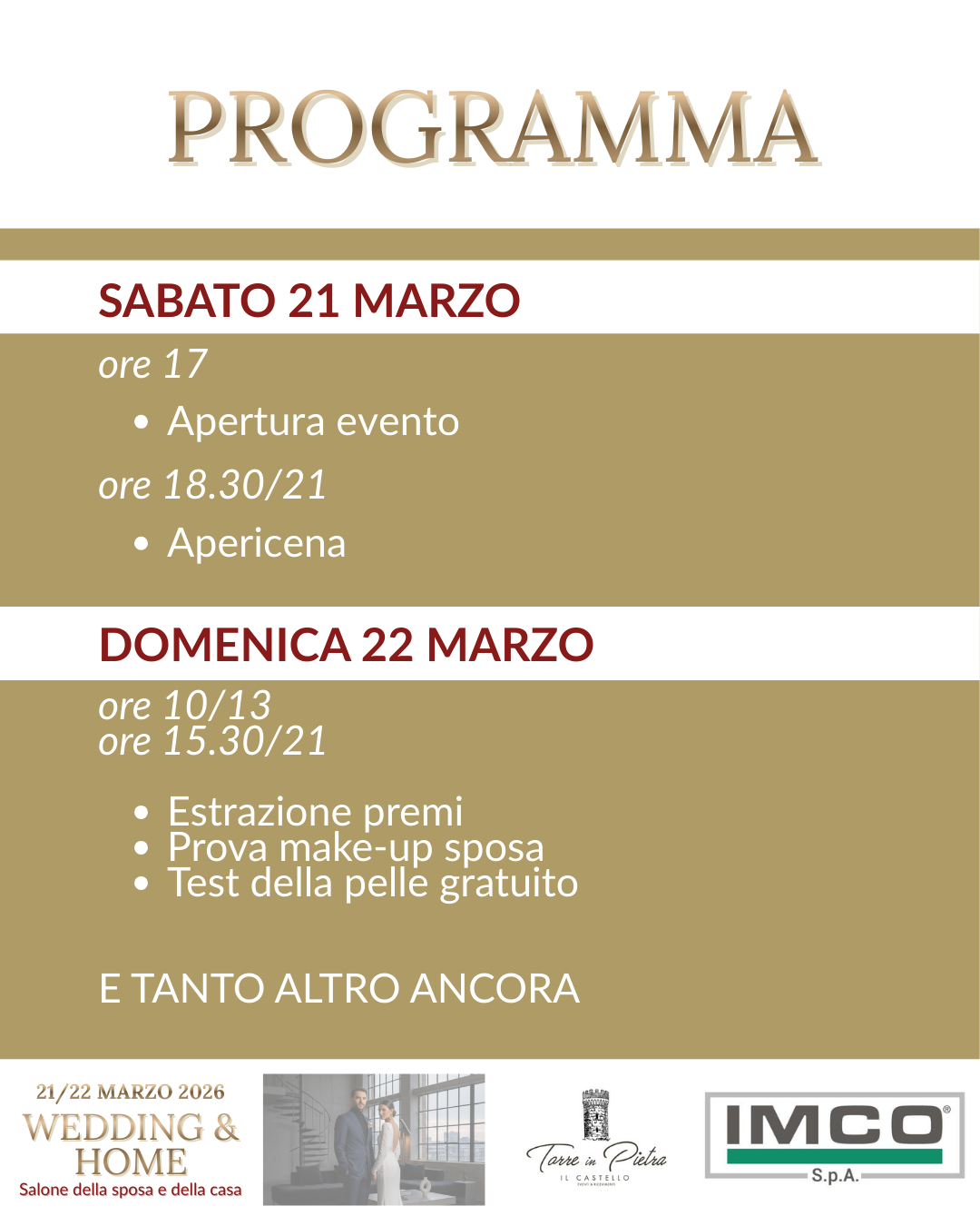 Durante la manifestazione sarà possibile incontrare professionisti del settore wedding e home, scoprire le ultime tendenze in fatto di arredamento, lifestyle e benessere, e usufruire di sconti e offerte speciali riservate ai partecipanti. Non mancheranno esperienze gratuite da vivere direttamente sul posto, pensate per coinvolgere e ispirare il pubblico.