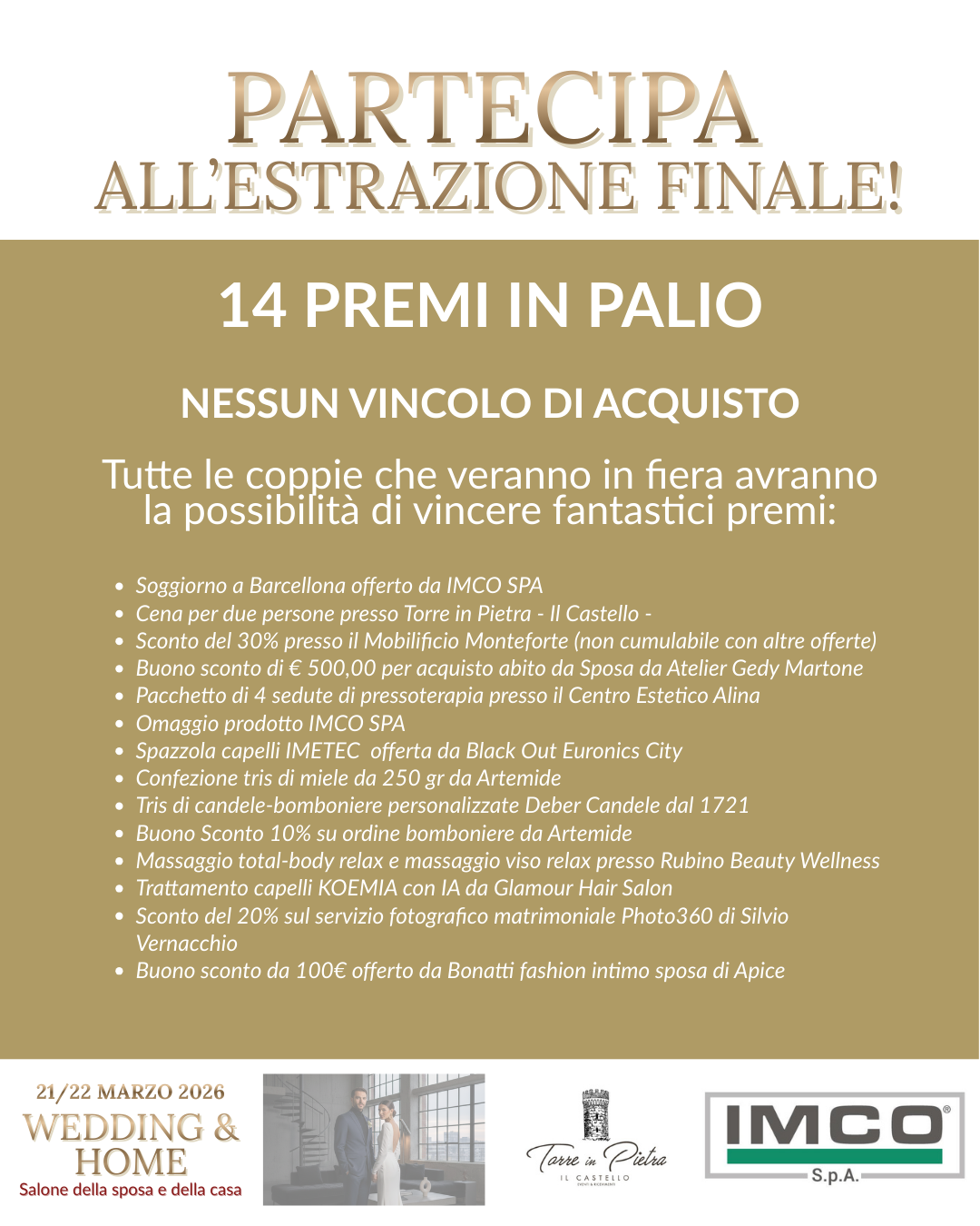 Wedding & Home sarà anche un’occasione per tentare la fortuna grazie ai numerosi premi esclusivi messi in palio dai partner dell’iniziativa. Tra questi: