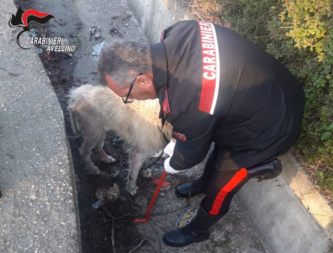 I militari dell’Arma hanno trovato un Pastore Maremmano denutrito, legato con una catena all’interno di un canale per il deflusso delle acque piovane.
