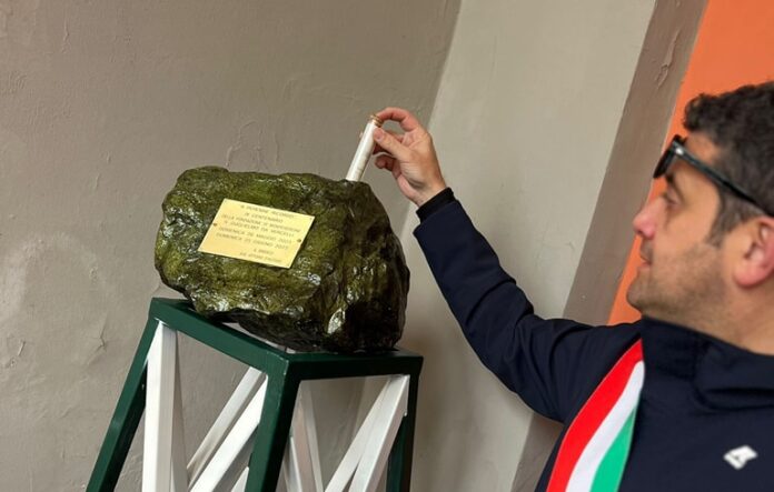 Si tratta di una scultura in una pietra del Partenio che custodisce al suo interno un cilindro in vetro contenente una pergamena con sigillo in ceralacca nella quale è narrato il ricordo di questa importante pagina della storia dell’Irpinia, firmata dall’artista e dal Sindaco della città. Una pietra scelta quale involucro resistente al tempo e alle avversità per proteggere uno straordinario e irripetibile ricordo in eredità alle generazioni future. D’Alessio ha scelto di installare l’opera presso la Stazione della Funicolare ritenendola uno dei luoghi della città più rappresentativi del legame della comunità locale con il Santuario di Montevergine.