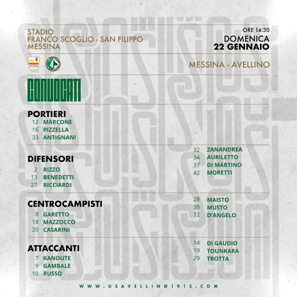 In vista del match tra Messina ed Avellino, previsto per la ventiduesima giornata del campionato di serie C, girone C, mister Massimo Rastelli ha diramato la seguente lista di convocati: