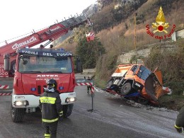 I Vigili del Fuoco di Avellino, nella mattinata di oggi sono intervenuti sulla statale 374, nel comune di Sant’Angelo a Scala, per un incidente stradale che ha visto coinvolto un automezzo spargisale della Provincia di Avellino, il quale in una curva si è ribaltato, per fortuna senza conseguenza per l’autista del pesante automezzo. Due le squadre dei Caschi Rossi della centrale operativa di contrada Quattrograna intervenute, di cui una con l’autogru, che hanno provveduto al recupero del veicolo rimettendolo in carreggiata.