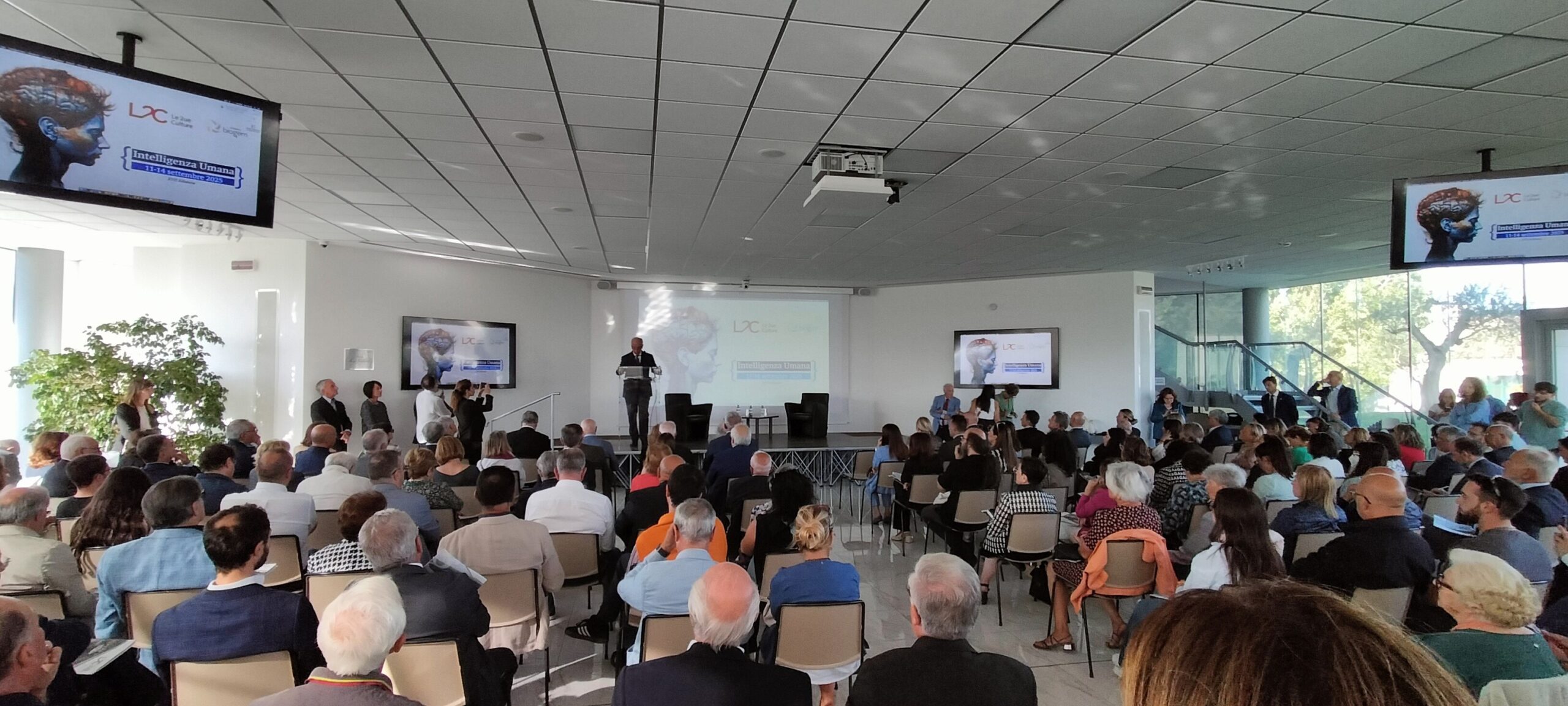 Questo primo momento ha dunque ben messo a fuoco come per il Ministro non si tratti solo di adempimenti istituzionali, ma di riconoscere il valore della scuola come luogo di crescita civile, oltre che culturale e formativa. La seconda tappa della visita è stata quella al meeting Le Due Culture, promosso da Biogem, che quest’anno (11-14 settembre 2025) ha scelto come tema “Intelligenza umana”.