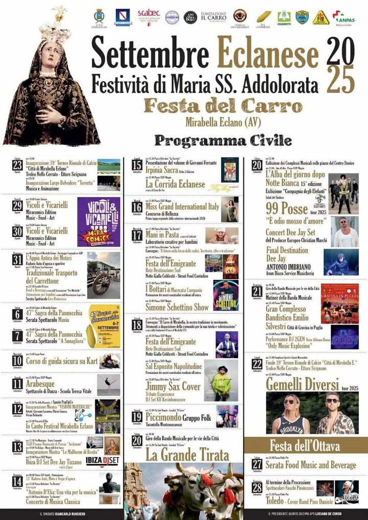 Anche quest’anno Mirabella Eclano si appresta a vivere uno degli appuntamenti più attesi dell’anno: il Settembre Eclanese – Festività di Maria SS. Addolorata e la celeberrima Festa del Carro. Una tradizione secolare che unisce fede, cultura e spettacolo, attirando migliaia di visitatori da tutta la Campania.