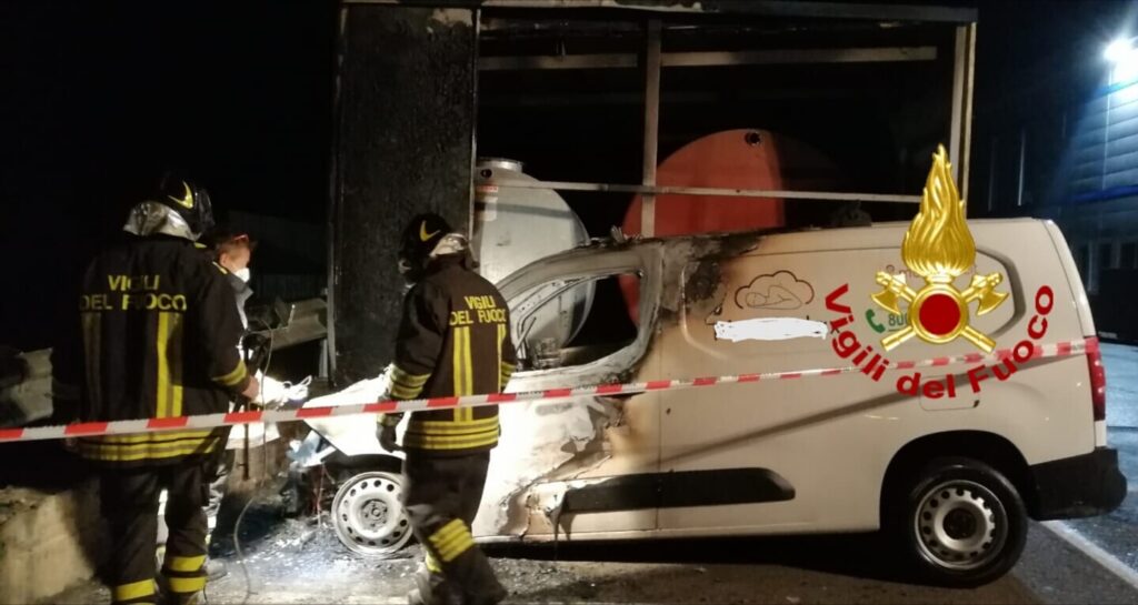 Le fiamme, domate dai Vigili del Fuoco, hanno interessato un furgone e causato danni ad una parete di un prefabbricato.