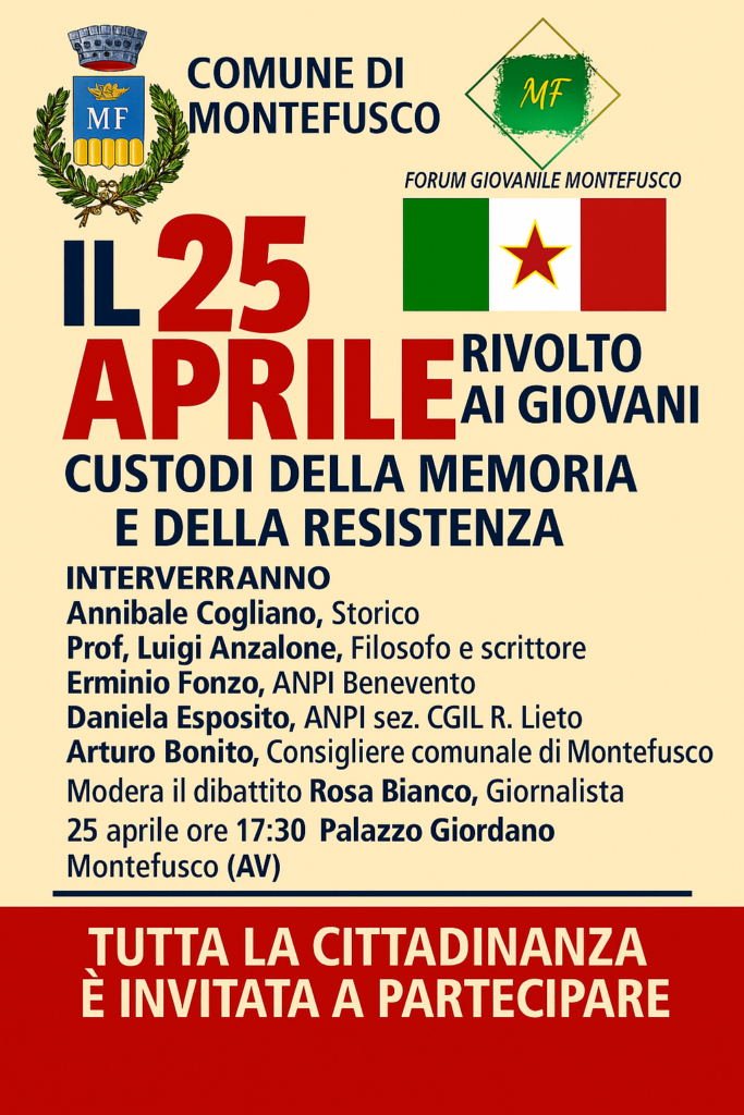 In occasione dell’80° anniversario della Liberazione dal nazifascismo, il Comune di Montefusco e il Forum dei Giovani di Montefusco organizzano il convegno “Il 25 Aprile rivolto ai giovani – Custodi della memoria e della Resistenza”, in programma venerdì 25 aprile 2025 alle ore 17:30 presso Palazzo Giordano Montefusco, (AV).