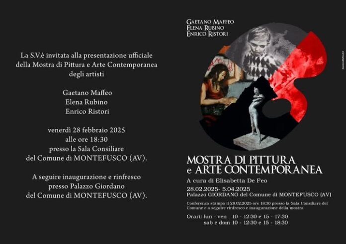 Venerdì 28 febbraio, alle ore 18:30, presso la Sala Consiliare del Comune di Montefusco, avrà luogo la presentazione ufficiale della Mostra di Pittura e Arte Contemporanea, a cura di Elisabetta De Feo, che vedrà protagonisti gli artisti Gaetano Maffeo, Elena Rubino ed Enrico Ristori. La mostra offrirà un’opportunità unica di ammirare le opere di questi talentuosi artisti, che porteranno a Montefusco una selezione di lavori che spaziano tra diversi linguaggi dell’arte contemporanea.