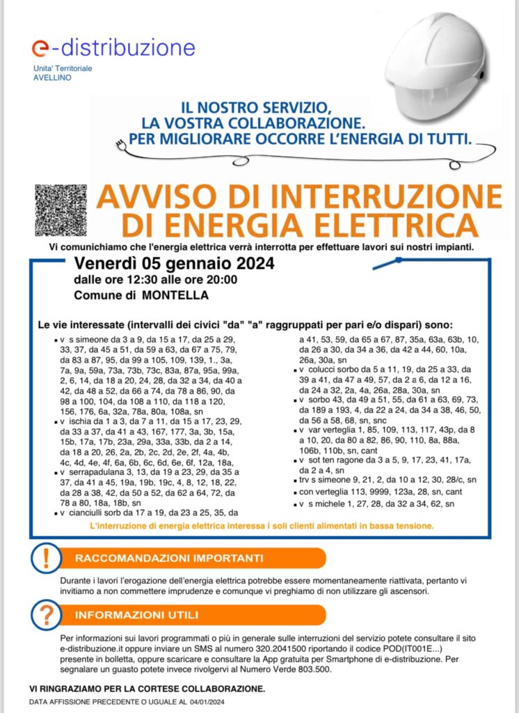 Il Comune di Montella comunica che venerdì 5 gennaio 2024, dalle ore 12:30 alle ore 20:00, si verificherà un’interruzione programmata dell’energia elettrica che coinvolgerà diverse vie all’interno del territorio comunale. Le aree interessate riguardano intervalli specifici dei civici, raggruppati per numerazione pari e/o dispari. Di seguito l’elenco dettagliato: