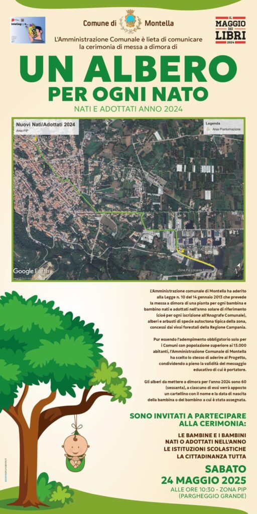 Anche quest’anno il Comune di Montella rinnova il suo impegno per l’ambiente e per le nuove generazioni con la cerimonia di messa a dimora degli alberi dedicati ai nuovi nati e ai minori adottati. L’appuntamento è fissato per sabato 24 maggio 2025 alle ore 10:30, presso la zona PIP (parcheggio grande).